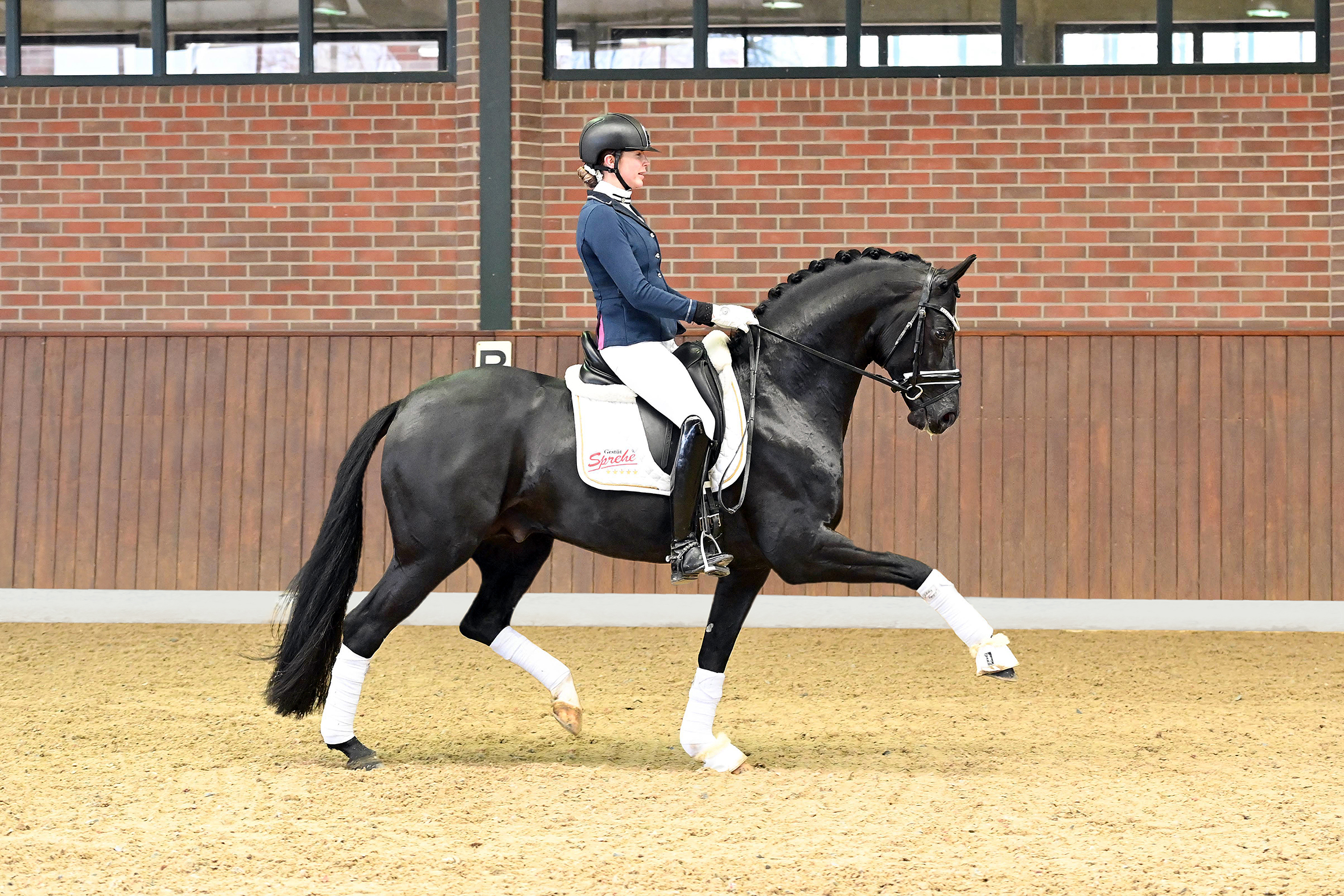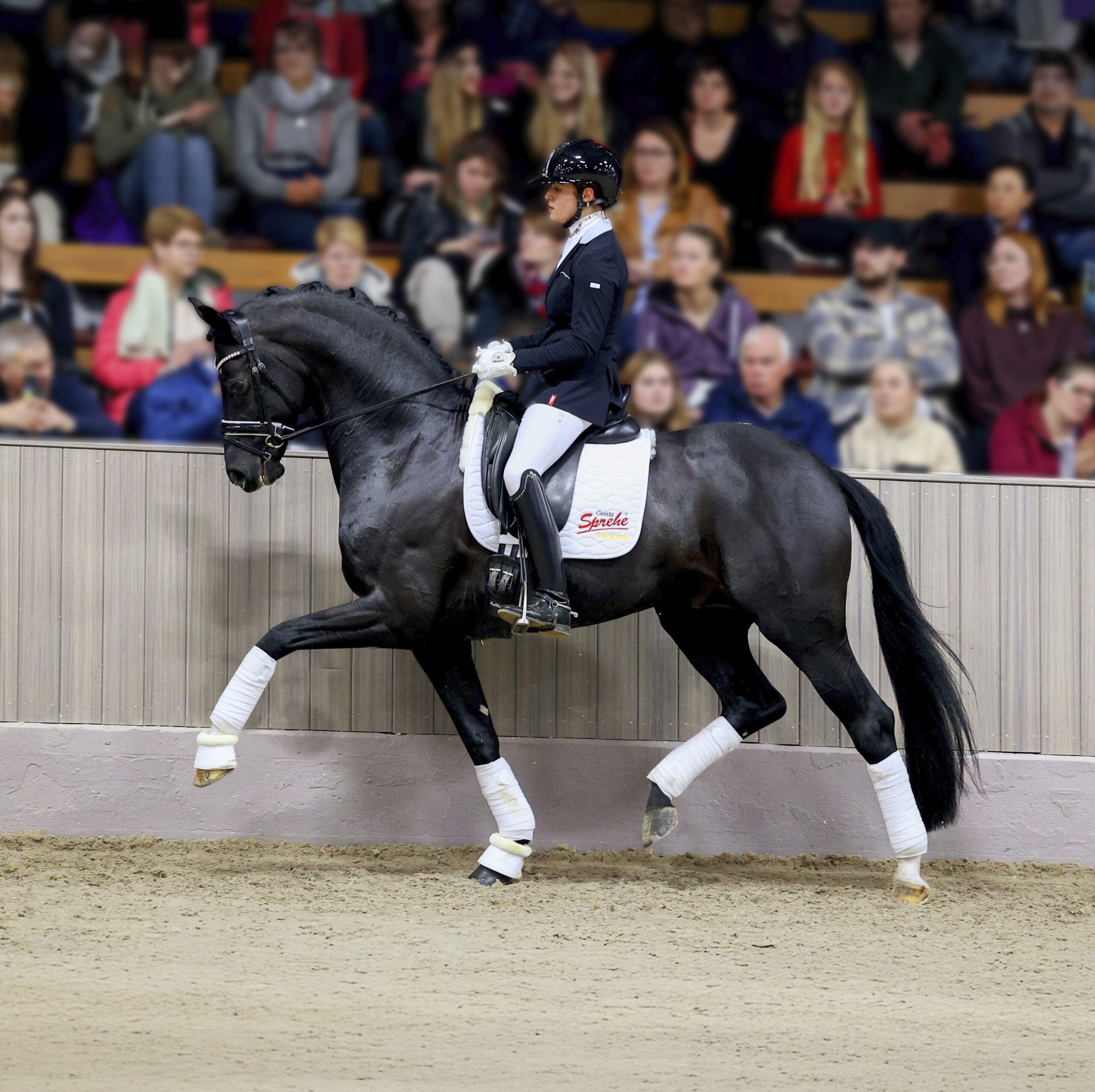 Ein gekörter Sohn des viel zu früh verstorbenen einstmaligen Jungpferde-Weltmeisters Dimaggio ist heutzutage kaum noch aufzufinden. Ein Dimaggio- Sohn aus einer überragenden Mutter, die zuvor bereits bereits zwei Prämienhengste in Vechta stellte, der seine HLP gewinnt, den ersten Turnierstart in einen Sieg ummünzt und dann noch mit einem überragenden Grundgangartenarrangement ausgerechnet in der begehrten Rappfarbe daherkommt?! Das klingt nach einem Märchen aus 1001 Nacht, aber genau das ist die Visitenkarte des Dimaggio Black. Er war das alles überstrahlende Maß der Dinge beim Sporttest in Münster/Handorf, mit einer phänomenalen Endnote von 9,40 konnte er die Prüfung mit Abstand für sich entscheiden. Unter Beatrice Arturi konnte er seinen einzigen nationalen Start 2022 in einer Dressurpferdeprüfung der Klasse M in einen Sieg ummünzen, um in der Folge erfolgreich an der WM junger Dressurpferde in Verden teilzunehmen.So konnte er direkt bei seinem Int. Start in Samorin die Prüfung mit über 83% für sich entscheiden. Doch damit nicht genug, beim darauffolgenden Int. Turnier im französischen Deauville setzte das Paar noch einen drauf und brillierte mit einem sensationellen Ergebnis von 90,6%. Seine ersten Nachkommen weckten bei der Fachwelt hohe Begehrlichkeiten. Er stellte mehrere gekörte Söhne, unter anderem einen gefeierten Prämienhengst auf dem Körplatz 2024 in Verden.