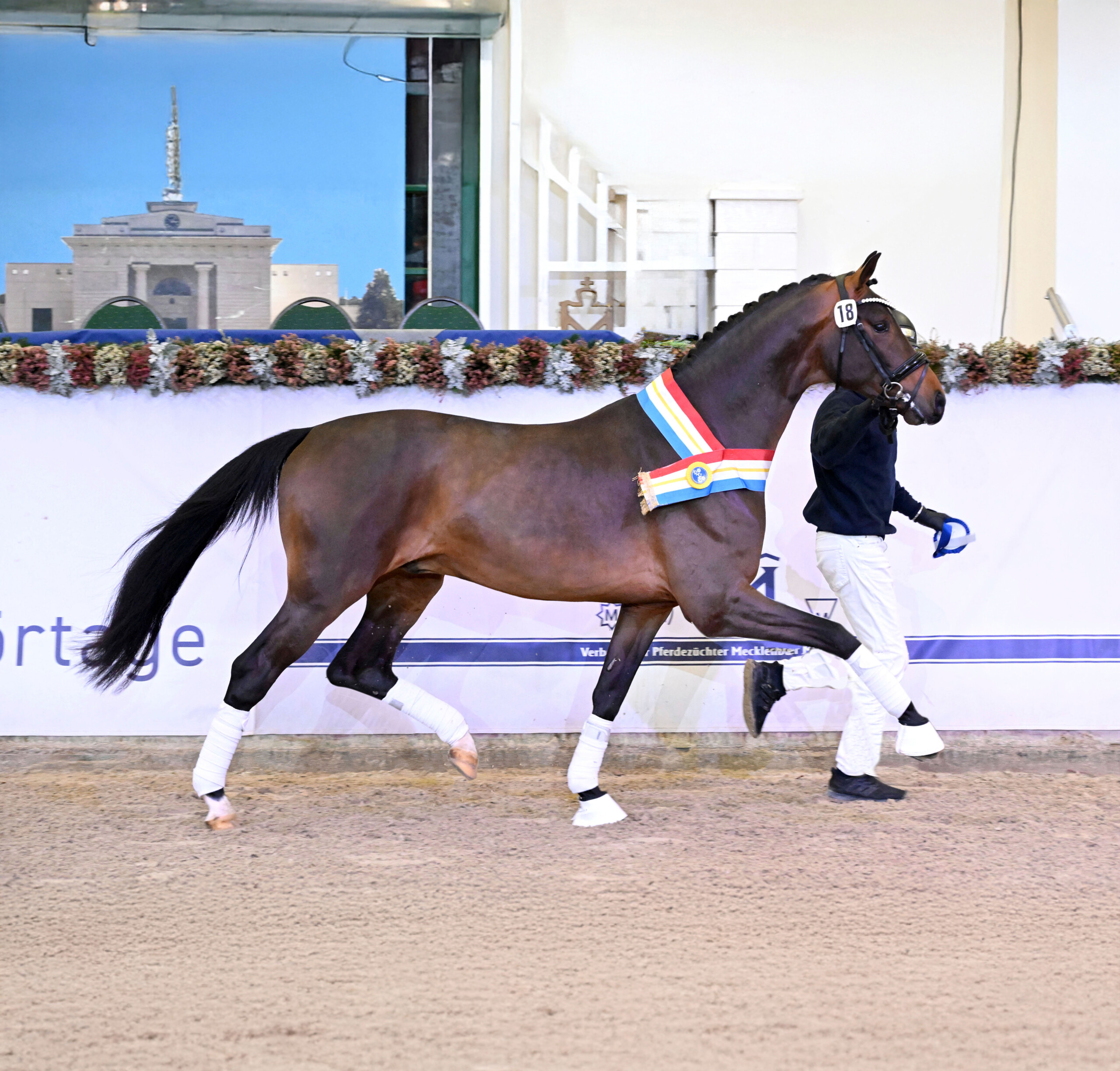 Dressurnachwuchs für den verwöhnten Anspruch, Prämienhengst der 34. Mecklenburger Körtage in Redefin. Galandos präsentiert sich in top-moderner Aufmachung, klar für das große Viereck prädestiniert. Er verfügt über takterhabene Bewegungen, immer groß in Balance, und demonstriert auch Schritt und Galopp von außergewöhnlicher Klasse.