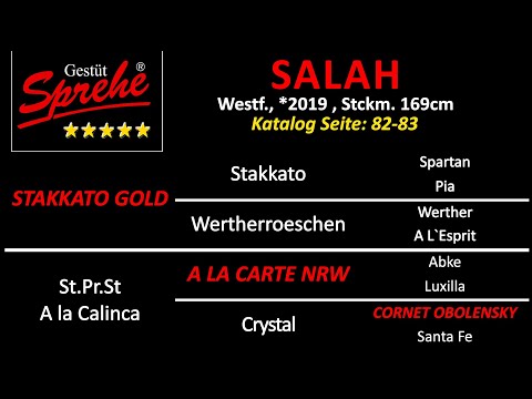 Kaum zu übertreffendes Gesamtpaket aus der züchterischen Schatulle der Springspitze Stakkato Gold. Salahs Sprungablauf, sein Bewegungspotential, seine Typausprägung – alles ist schlichtweg ultramodern und von besonderer Güte. Der deutlich im Hengsttyp stehende Nachwuchsbeschäler besticht mit Schmelz und guten Bewegungswerten. Besondere Erwähnung verdienen seine Trabmechanik und der stets hervorragend im Bergauf vorgetragene Galopp. Anlässlich seiner Körung in Münster/Handorf zeigte Salah mit überragendem Vermögen, blitzschnellen Reflexen und atemberaubender Schnellkraft in der Freispringgasse sein Ausnahmetalent und wurde zum zweiten Reservesieger der Veranstaltung gekrönt. Standesgemäß absolvierte Salah 2022 den ersten Teil seines Hengstexamens (Springanlage 8,50).