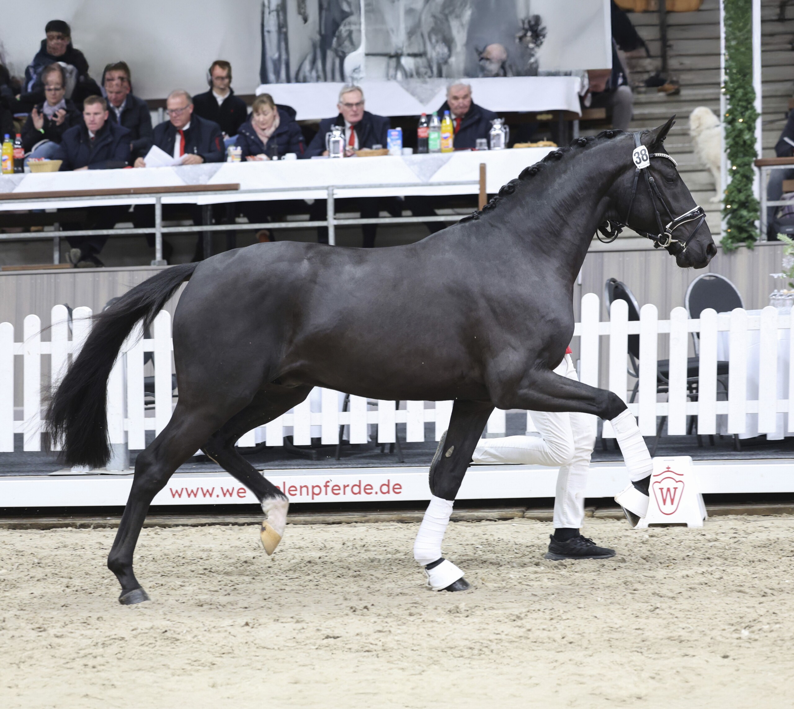 Championatsmodell der besten Sorte, dem Idealbild des modernen Reitpferdes nahe. Tokyo AS überzeugt durch drei exzellente Grundgangarten, aus kraftvollem Rücken fleißig, effektvoll und mit steter Bergauftendenz vorgetragen. Der in vielfacher Hinsicht faszinierende Vater Toto Gold gab züchterisch und sportlich einen überzeugenden Einstand, war M-siegreich und stellte im ersten Jahrgang mehrere gekörte Söhne.