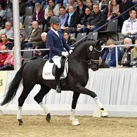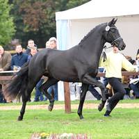 A brilliantly presented noble black stallion, clearly recognizable as son of his popular ancestors! Large-framed with strong limbs harmoniously integrated into the body – he is gifted with phenomenal basic gaits, always engaged hindquarters which cause a maximum of basic impulsion that has no equal. He fascinated with pure elasticity at the presentations in Verden every day of licensing. First impressions on the lungeing-rein and under saddle confirm: here we have something really special. His steady willingness to perform with much inner peace and his first-class character make him absolutely exemplary.